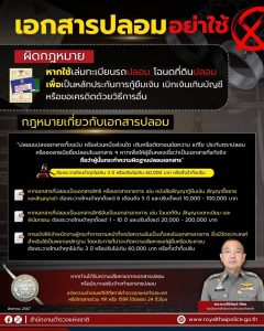 ทั้งนี้ หากพี่น้องประชาชนได้รับความเสียหายจากการใช้เอกสารปลอม หรือพบเบาะแสว่าทีบุคคลใดรับจ้างทำเอกสารปลอม สามารถแจ้งความดำเนินคดีได้ที่สถานีตำรวจทุกแห่งทั่วประเทศ หรือโทรสายด่วน 191 และสายด่วน 1599 ได้ตลอด 24 ชั่วโมง