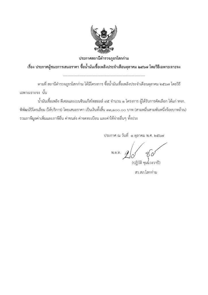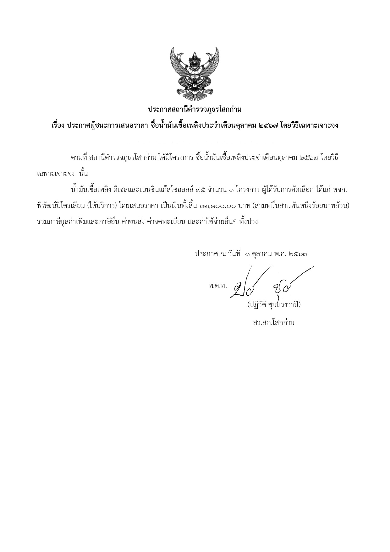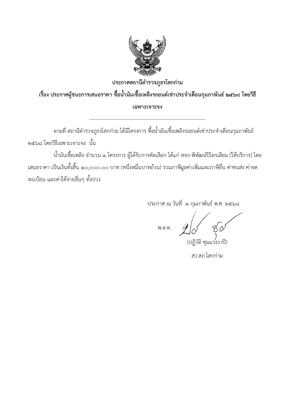 ประกาศผู้ชนะการเสนอราคาซื้อน้ำมันเชื้อเพลิงประจำเดือน (รถปกติ)